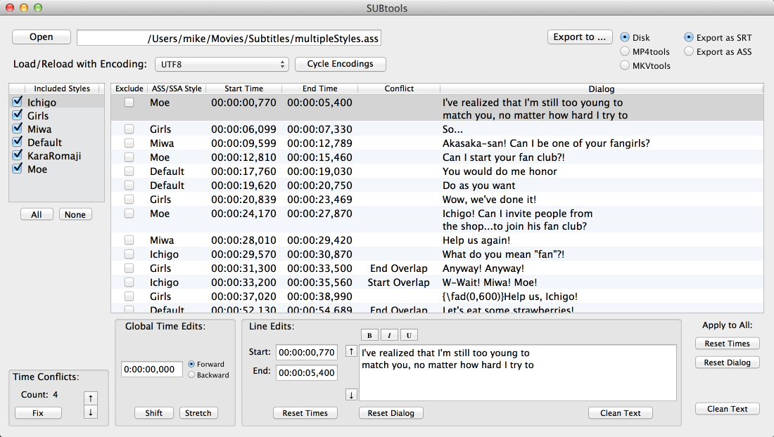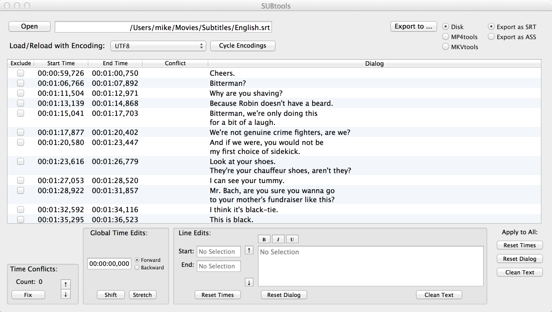 Note that SUBtools will allow you to save SRT subtitles with unresolved timing conflicts, but the resulting file may not work properly depending on its use.