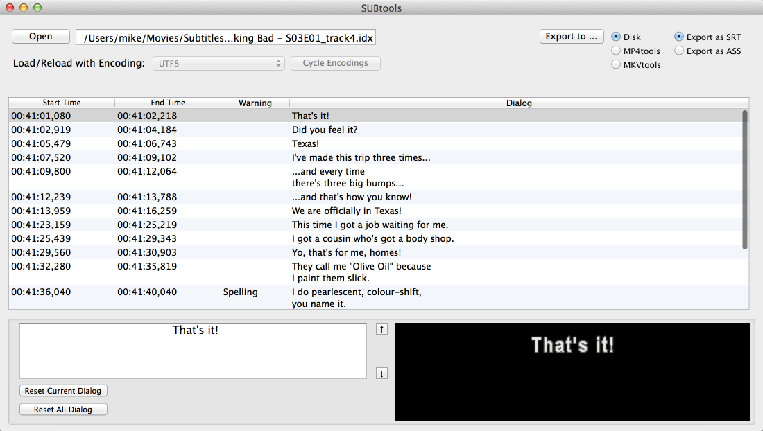 This lists the dialog and time codes of each subtitle line. In the warning column, SUBtools will warn you about what it thinks are potential spelling mistakes. Note though, that it will not find all misspellings. You can edit the text by selecting the line of interest and working in the Line Edits section.